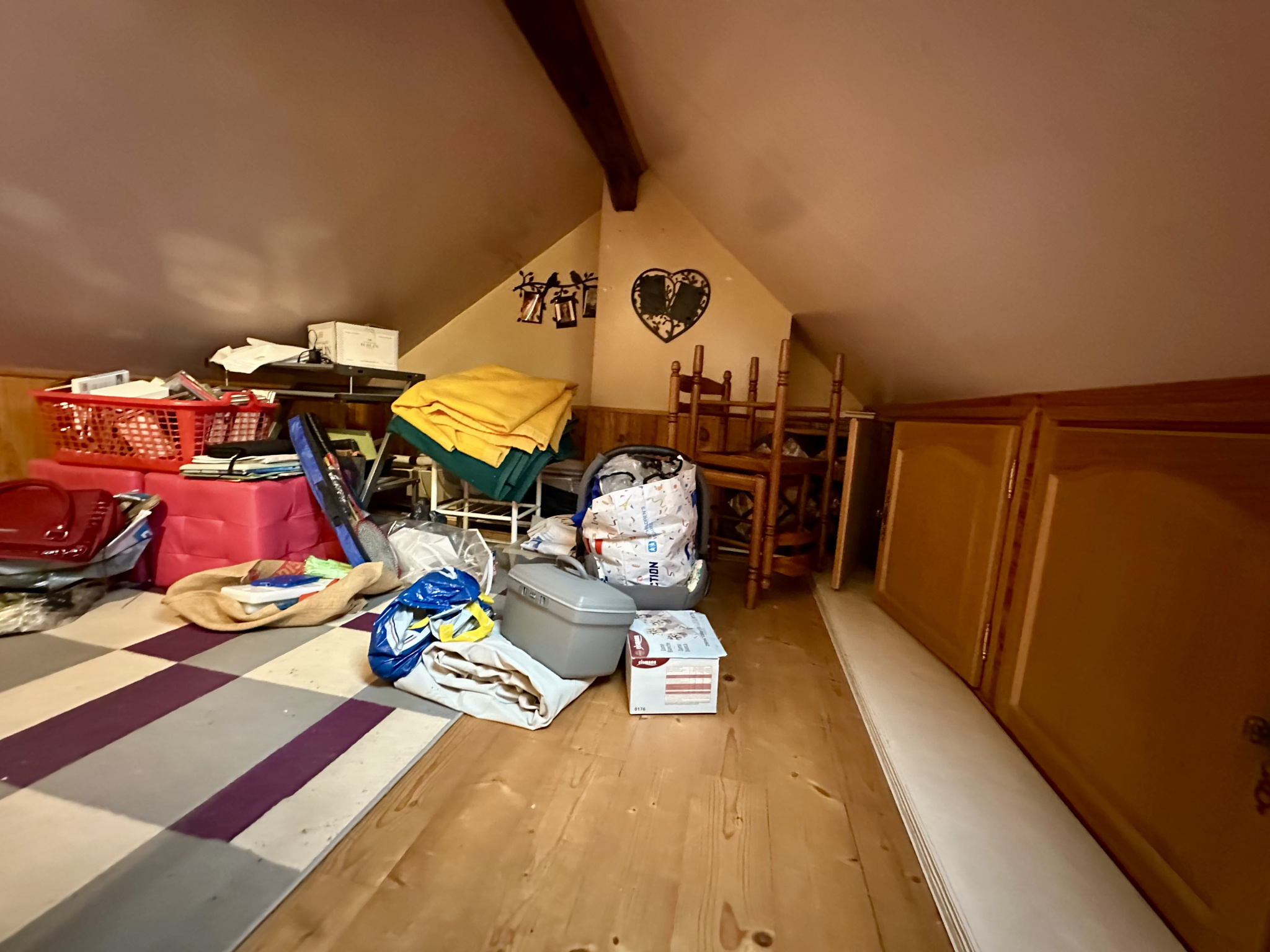 À l’étage, une grande salle de bains avec baignoire et douche accompagne deux chambres, dont l’une bénéficie d’un accès direct aux combles aménagés. Une petite cour bétonnée complète l’ensemble.